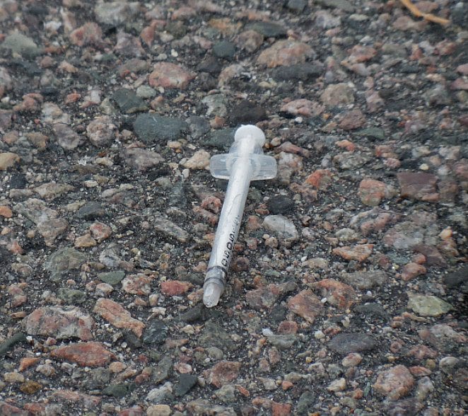 While out on the ever increasingly mean streets of Quincy this week, Quincy Quarry News personnel happened up an all but assuredly used syringe lying in the middle of an intersection of adjacent to one of the two main entrances to Quincy High School.