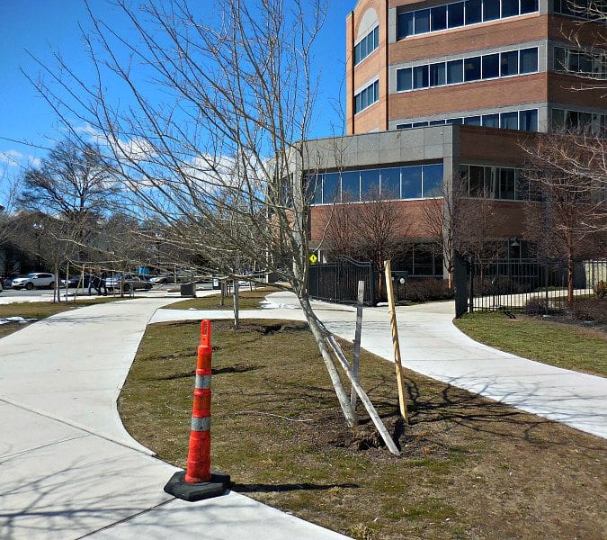 Regardless of how this particular tree was whacked, Quincy Quarry’s unofficial tally until leaves might or might not reappear this spring would suggest that upwards of roughly 20% of the mostly larger and thus more expensive trees planted last spring along the Hancock Street Misalignment Project have succumbed to various fatal ends, ranging from carelessness by landscapers to possible actions sinister.