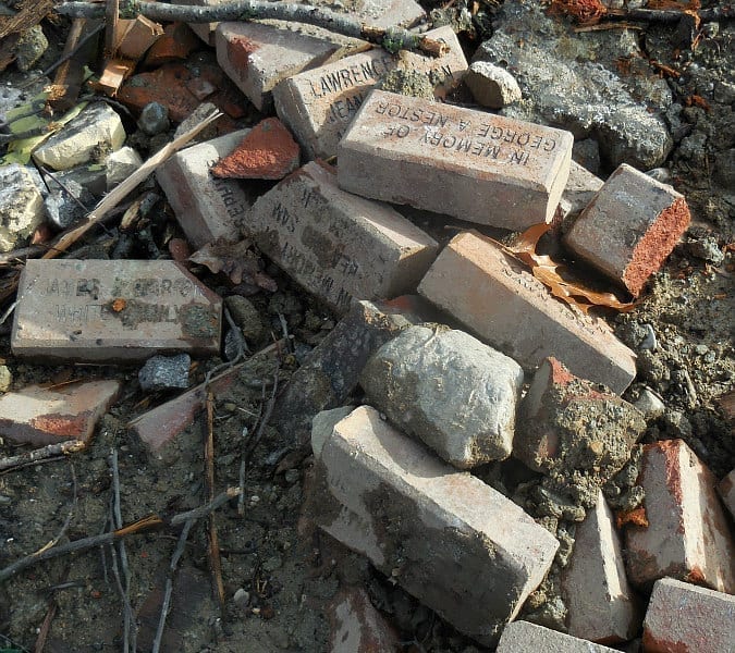 Also, many of the engraved memorial bricks as well as plain ones were found in sound and thus looking to be readily reusable condition even if they were scattered among all manner of other construction debris.
