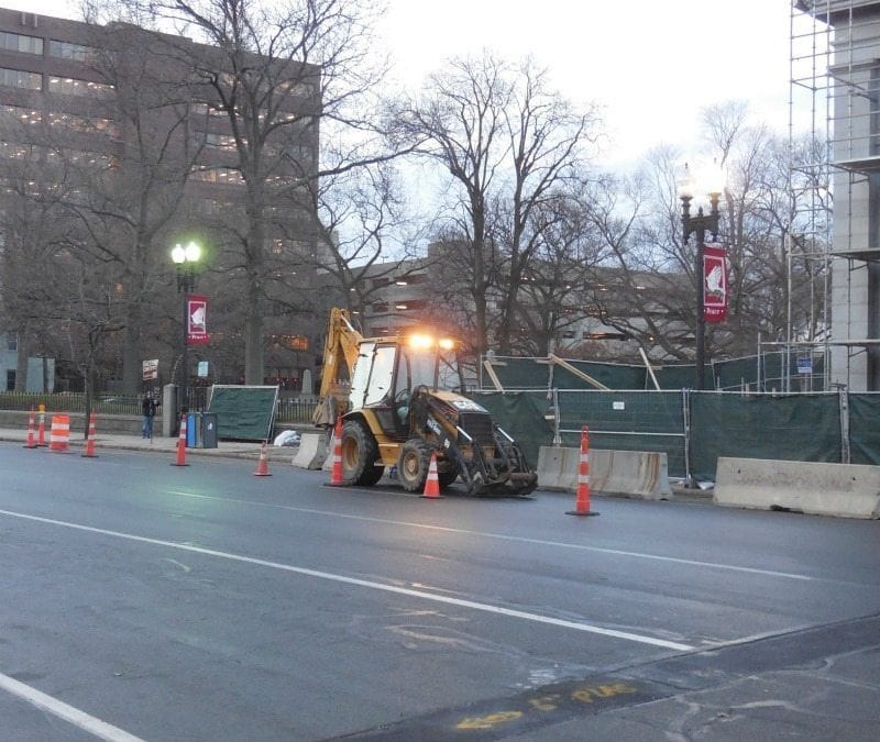 On Monday morning workers were exclusively photographed by Quincy Quarry wrapping up the removal of Jersey barriers in front of the Hancock Cemetery where contractors have been staging cleanup activities tied to demolition and replacement work necessary in in the wake of the devastating old City Hall fire in September.