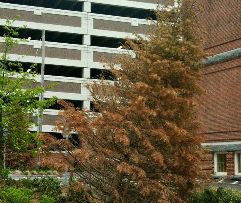 The fatalities include all of five members of the conifer family and who were relocated to the grounds of Coddington Hall last summer, only to later die as a result of obvious neglect by the City’s Park and Forestry Department.