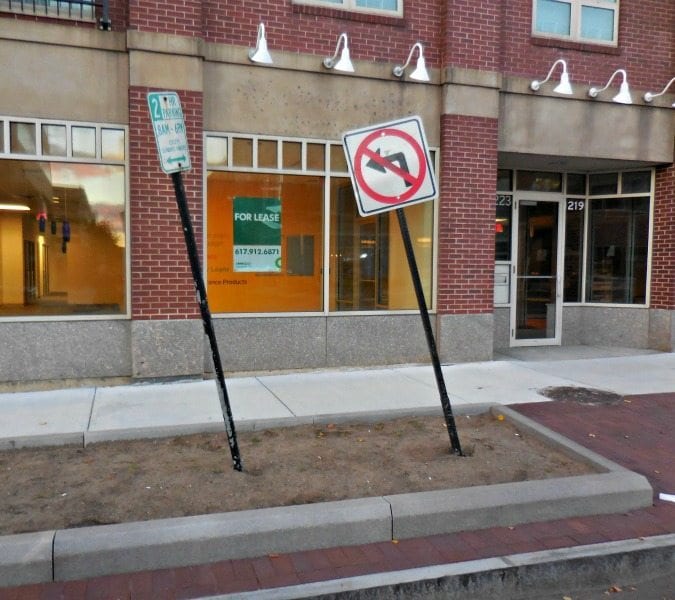 In any event as well as in the meanwhile, street signs have been planted in the new planters that will not have new trees until (perhap, ed.) sometime next year.