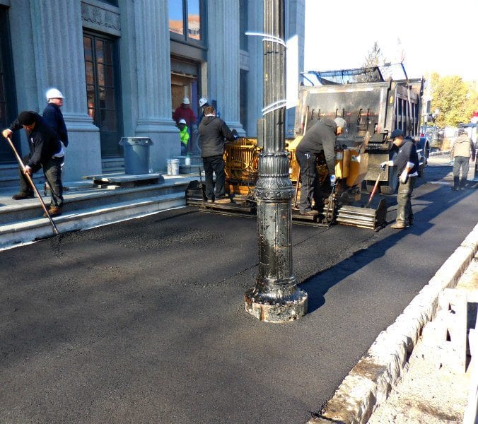 In a tacit admission that Mayor Thomas P. Koch’s grandiose plans for his $30 million but acre and a half dream theme park in front of Quincy’s City Hall is not happening anytime soon, construction workers were laying asphalt in front of City Hall this week in advance of the planned December 5 gala photo op reopening of old City Hall.