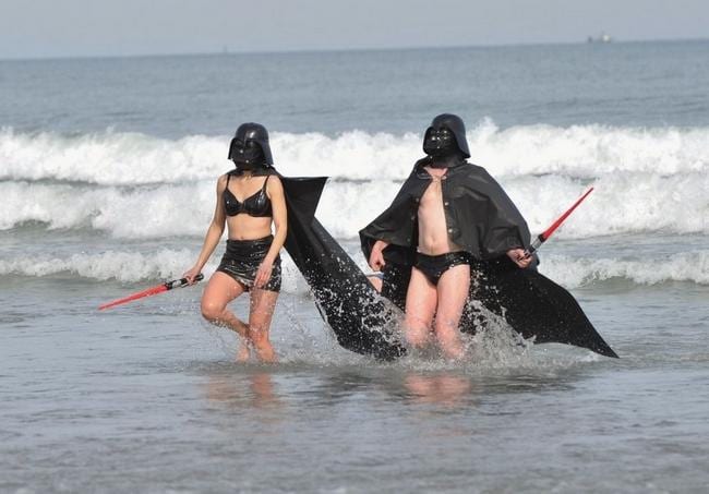 HULL – Michelle Varney sat on a ledge of the promenade along Nantasket Beach with her fiance Kory Haddock and their nine month old dog Django, baffled by the creatively costumed crazies lining up to dive into the chilly Atlantic water.