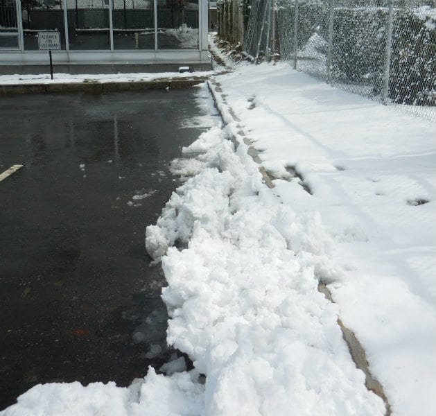 Sunday morning’s quick to fall and almost as quick to mostly melt away snowfall received the usual VIP treatment at the City Hall VIP parking lot: while the storm was on a Sunday while City Hall was closed for the weekend, the VIP parking lot was both duly plowed clear of snow as well as so done shortly after the snow stopped falling.