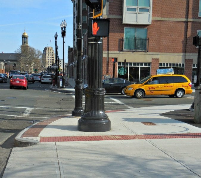 The action: putting new pedestrian crosswalk traffic signals for a short run of sidewalk along Hancock Street in Quincy Center at the entrance way to a private parking lot.
