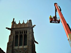 Bethany Church in Quincy Center is finally fixing ornamental stonework atop its towering bell tower that was struck by lightening and so shattered just days short of four years ago.