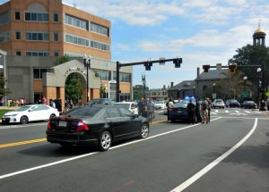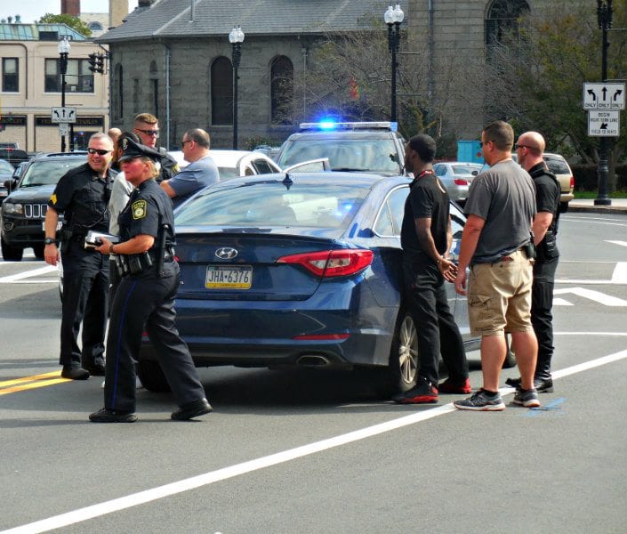 Shortly after the lunch hour today, over a handful of police cruisers and unmarked cars were variously parked along or in the middle of Hancock Street in front of City Hall in Quincy Center as at least a dozen police officers in uniform or plain clothes swarmed and put at least two parties into cuffs as well as thus all but assuredly under arrest.
