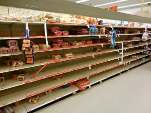 In particularly, bread, eggs and milk so as to make the region’s traditional storm meal of French Toast and other such storm staples were all but nowhere to be seen.