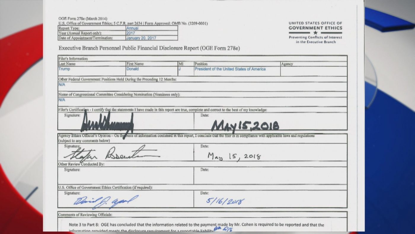 Trump 2018 disclosure form discloses payment to Michael Cohen for paying off Stormy.