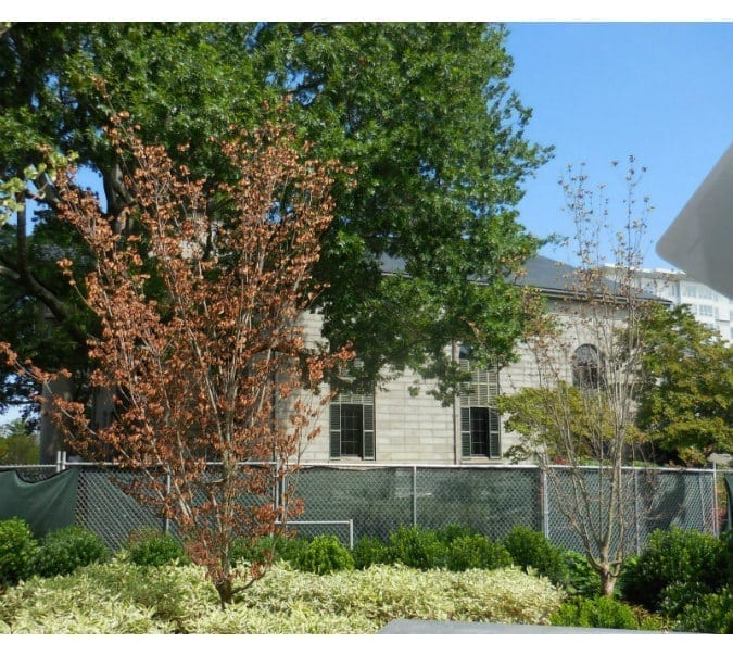 In the meanwhile, a number of the other new trees in Kim Jong Koch Plaza are also showing signs of stress; unfortunately, given these two apparent demises, bets can no longer be placed as to how many of these new and mostly expensive to very expensive trees will be deceased by the start of the Summer of 2019.
