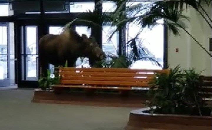In any event, as it was lunch time the moose grazed on some plants in lobby before it was encouraged to leave the building.