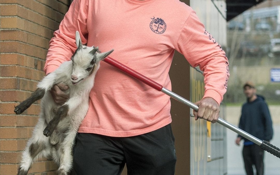 Animal Control Officer Pat Cherry of the Worcester Police Department snares a young goat seen running around the outside of a package store on Millbury Street on Sunday. A Rick Cinclair/Telegraph and Gazette image