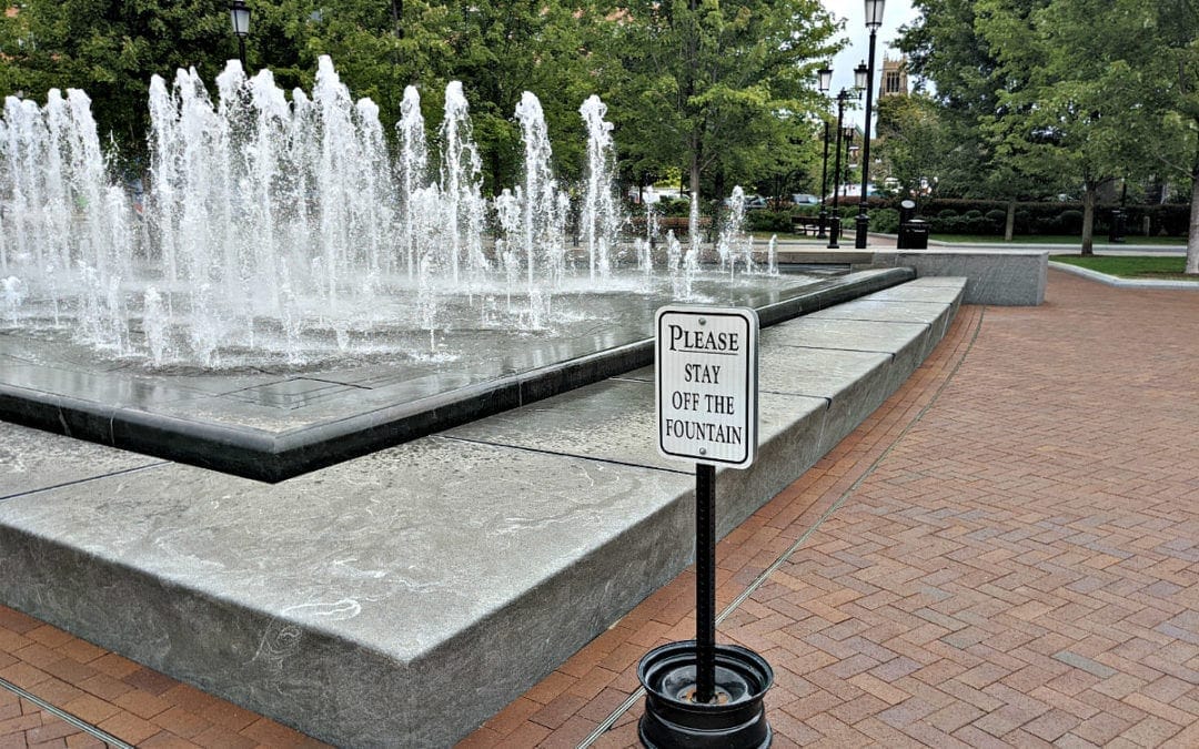 One would think that on a reported thirty-five million dollar taxpayer-funded project – and with millions more planned to be spent on even more over the top landscaping to follow – that someone would have duly addressed how to forestall passersby from using the fountain as a splash pad than signage based upon an old motor vehicle wheel.