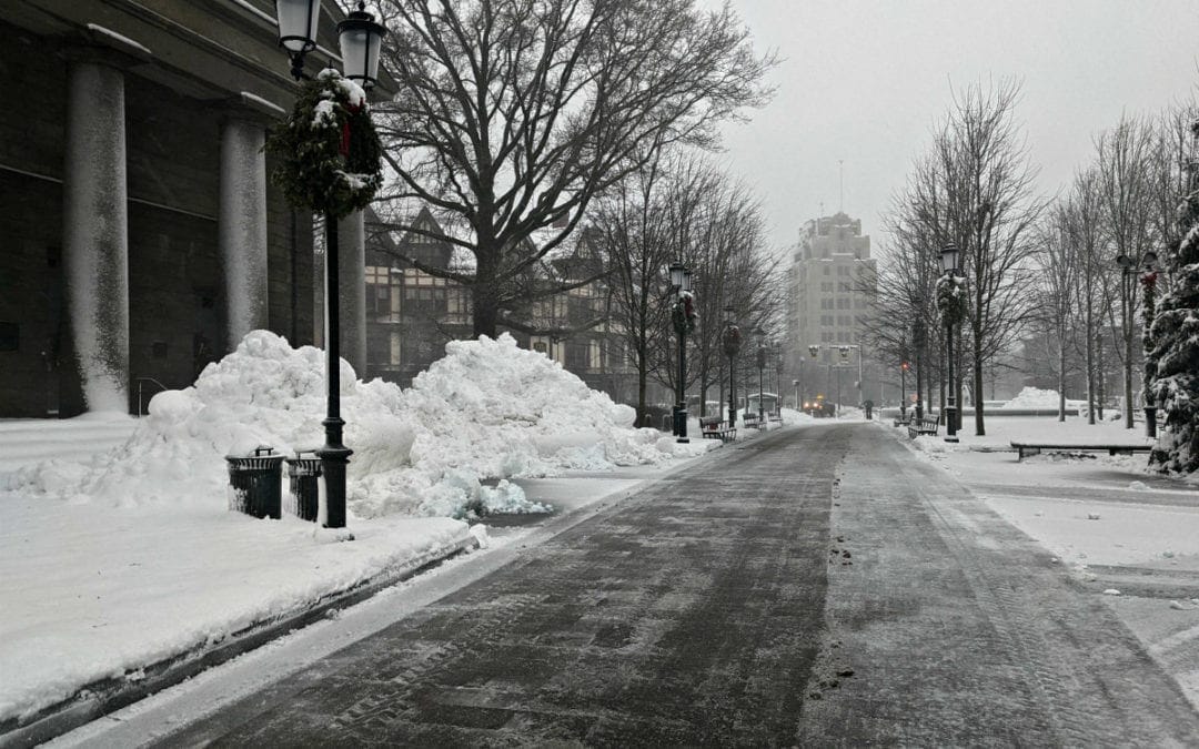 The apparent reason: so that Kim Jong Koch Plaza could be widely cleared down to the pavement before dawn’s early light this morning while still amidst a winter snowstorm emergency.