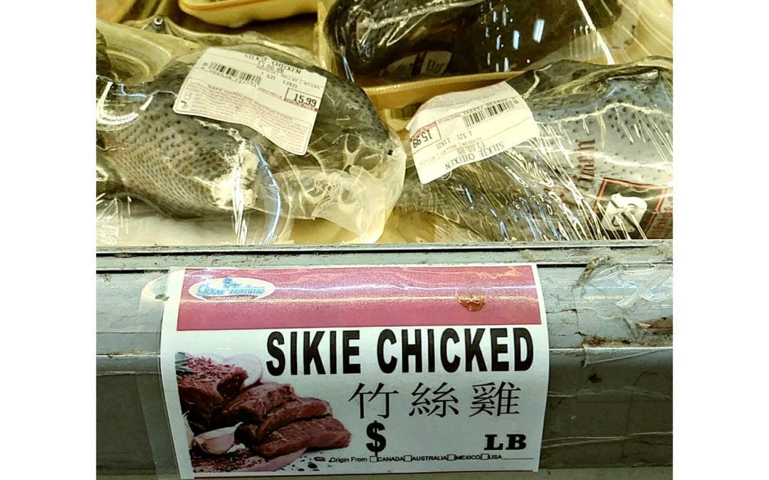For starters, this chicken offered for sale at a local market was mislabeled via a typo – it is not “Sikie Chicked;” rather, it is Silkie Chicken.