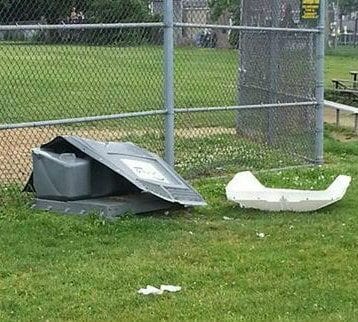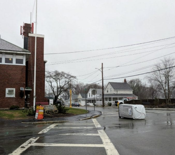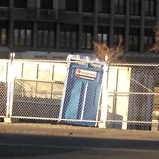 Courtesy of a Quincy Quarry Twitter feed follower comes a drive-by shooting of an apparent wind-tipped portapotty at the FoxRock’s outsized apartment complex underconstruction complex at the site of the former Quincy Medical Center.