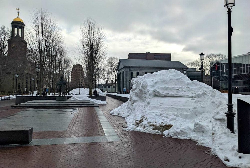 Four days after the not quite record-setting Bombobensis Blizzard of 2022, Kim Jong Koch Plaza in front of Quincy’s two city halls is still laden with large as frozen piles of snow as of late in the afternoon of Ground Hog’s Day in what one could argue is a tribute to Puxatawny Phil.