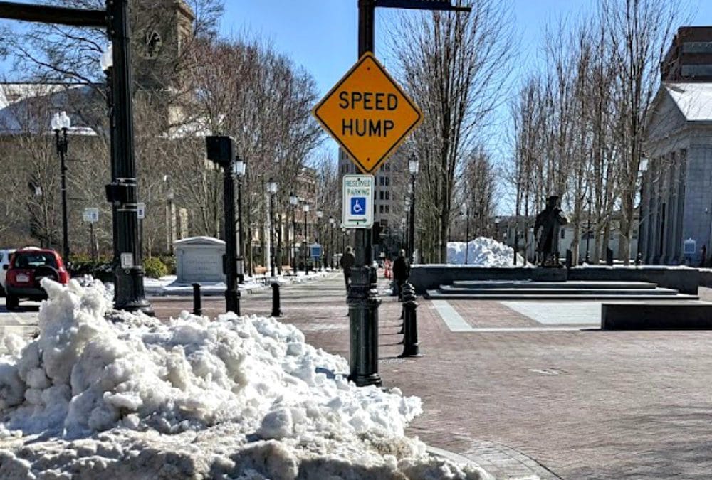 Quincy Center Snow Pile snow blocks disabled parking in parking scarce Quincy Center.