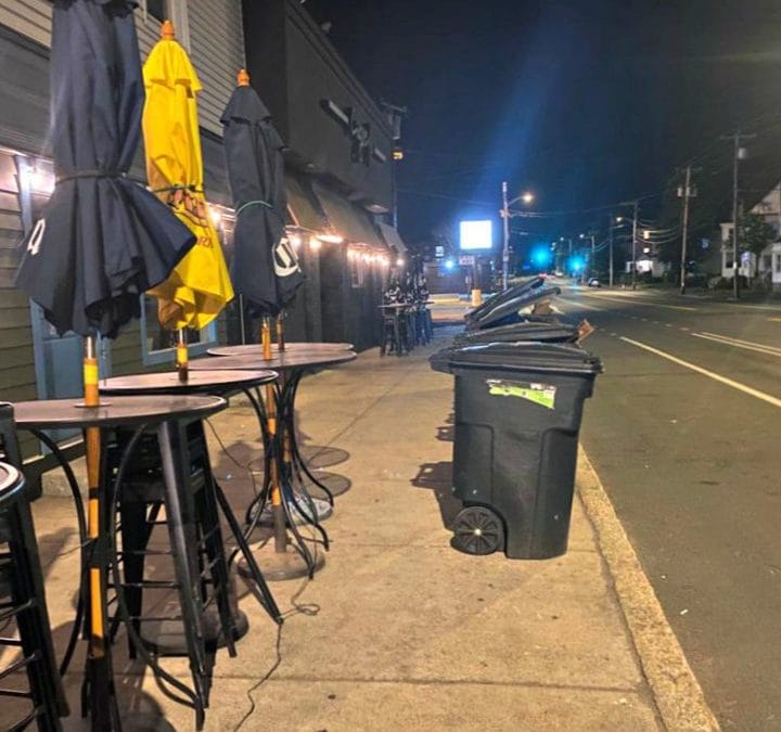 And the problem itself: a popular local purveyor of adult libations and comfort food is koch-blocking the sidewalk with its trash cans after closing time.