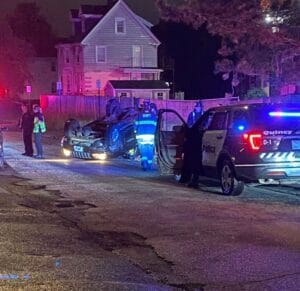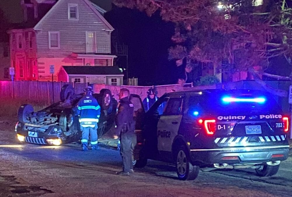 A Quincy Quarry Citizen Photojournalist who was out and about endeavoring to walk off a bout of insomnia on Saturday night happened up a full fire and police response to a rolled over SUV on Bigelow Street, a narrow residential street roughly parallel to Revere Road and McGrath Highway near the Quincy District Court House, and so took the pictures featured in this Quincy Quarry story.