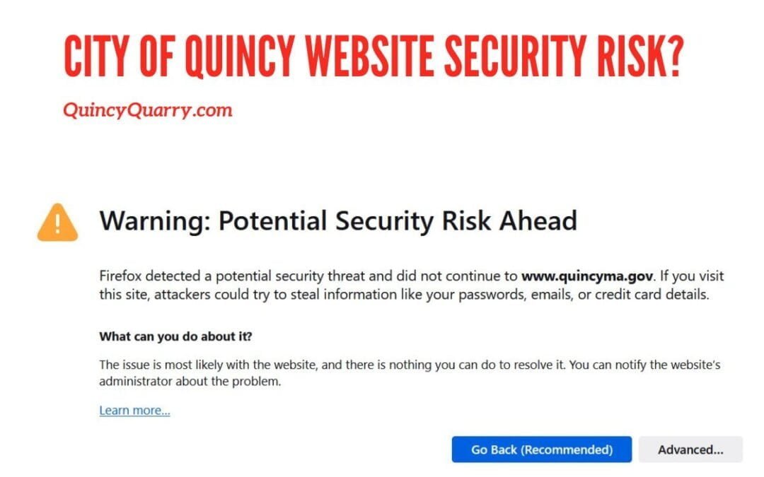 Last night while a Quincy Quarry staffer was in the process of seeking to check for something that should be posted on the City of Quincy website, a disconcerting security warning popped up instead of the City of Quincy homepage.