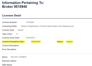 Another odd thing is how the out of town property owner’s purported local real estate agent, occasional spokesperson, and apparently the owner’s real estate advisor’s real estate broker’s license appears to have expired last year.