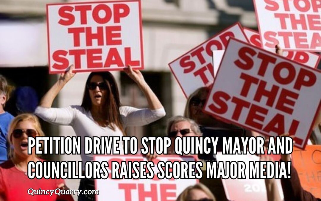 As the short time shot clock winds down today to effect a herculean effort to gather 8,000 local voters’ signatures on a recall petition of a sort to void both the recently approved 89% raise on a pension calculation basis for Quincy Mayor Thomas Koch and 49% raises for the mayor’s rubber stamp tools on stools on the city council, regional media have picked up on A Just Quincy’s efforts to void these raises.
