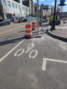 Two steel poles installed in the middle of a bicycle lane along McConville Way in Quincy Center.