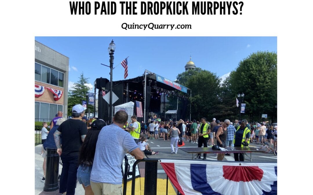 Regardless, the touts on the Quincy Quarry News’ sports desk and sports book are currently posting serious odds as to the likely funder of the Drop Kick Murphys’ recent performance which clearly indicate that an at least significant funder to be the real estate company that is seeking a serious tax break and zoning variances for its plans to redevelop a strip mall in Quincy Center where Boston Chicken once had a location.