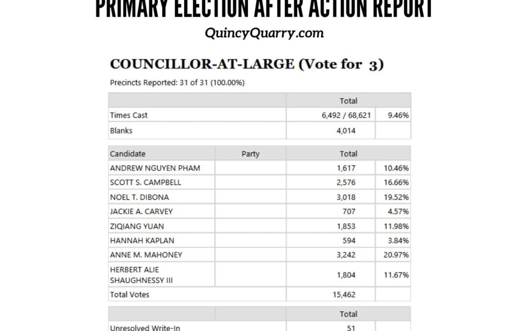 In the eight person race to cut down to six candidates to compete for three at Large council seats in November’s general election, the two newcomers who were expected by Quincy Quarry News to fall by the wayside care of the primary election did so.