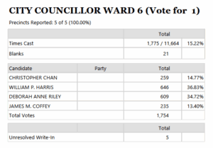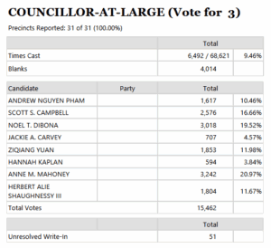 And as for surprises in this primary election, one was how a former at Large Councillor running to return to the city council topped the field as well as by a fair margin over the usual at Large top vote-getter.who instead finished second in spite of or perhaps because of his yet again littering Quincy with campaign signs.