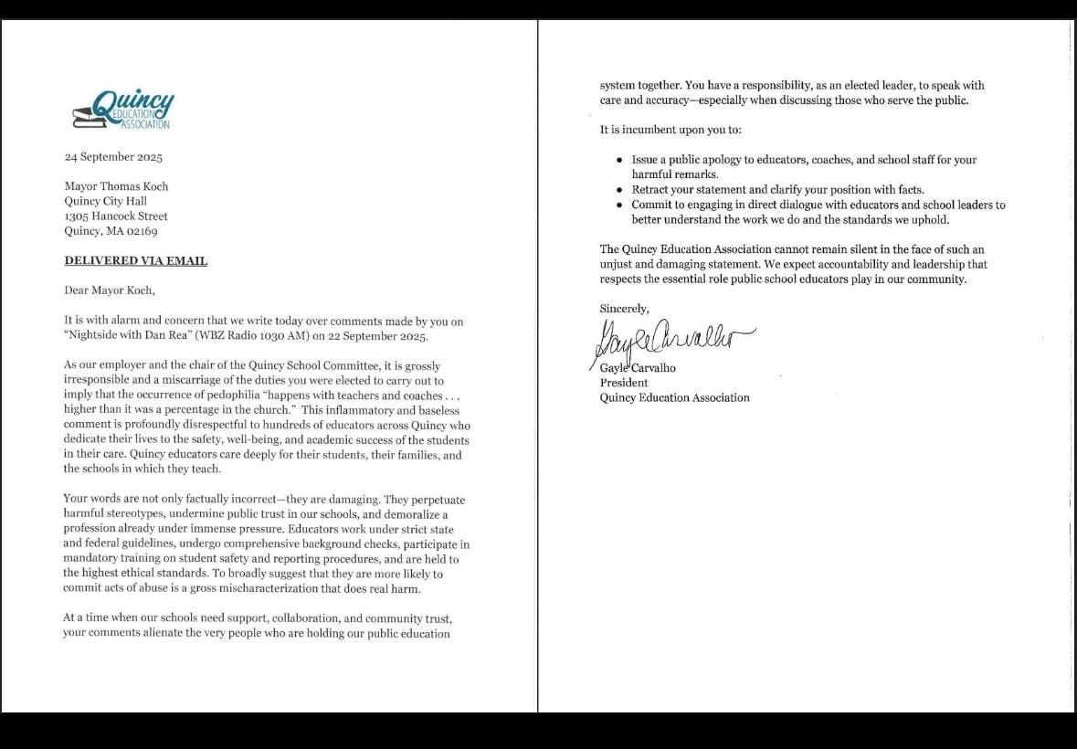 It is time (as in prior to the November 4th election) for all members of the city council and school committee to publicly state their opinions on what was said during the WBZ 1030 interview of Thomas Koch, Mayor of Quincy, MA.