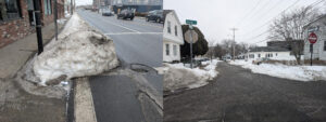 Snowbank intruding four feet into the street, left; snow piles impacted residential street, right.