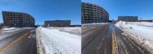 Right lane for through traffic along Commander Shea Boulevard, fully covered with snow, left image;