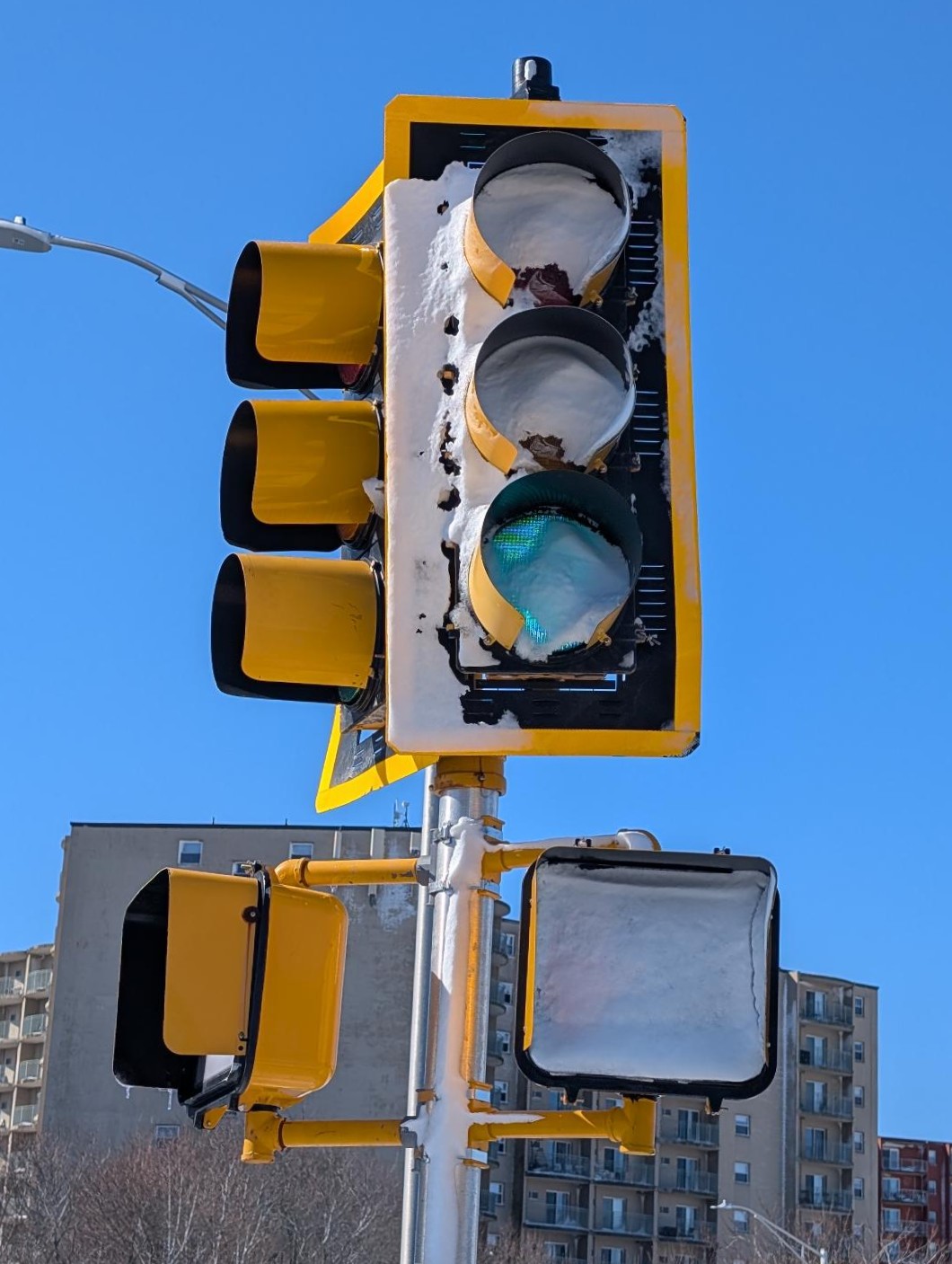For example, midday Tuesday most of the sets of traffic signals along Squantum Street from Hancock Street to Harvard Street. were covered over by frozen snow.